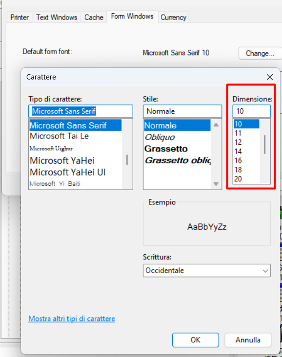 Aperto il Menù "Change..." potremmo modificare lo stile di scrittura, ma vi consiglio di tenere quello di base per evitare di incorrere in errori di formattazione, e soprattutto la dimensione, quella di base è a 8, generalmente io consiglio la 10, che dalle prove risulta quella più leggibile senza essere troppo grande, per chi magari ne avesse bisogno può spingersi anche più su!